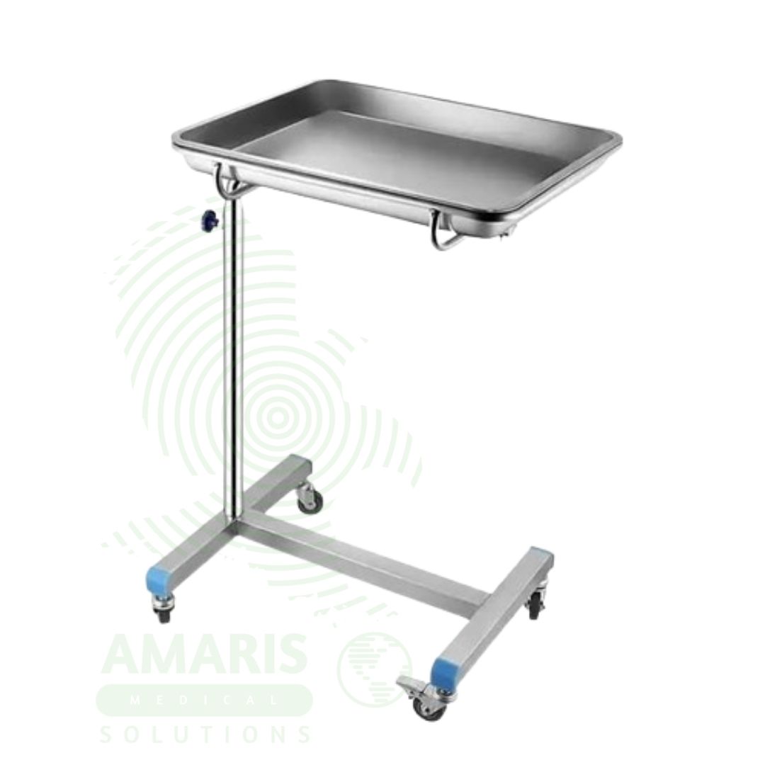 Primary Use: Provides a mobile, adjustable-height table used in operating rooms and procedure areas to hold sterile instruments, supplies, and equipment within easy reach of the surgeon and scrub nurse. The Mayo stand is positioned over or adjacent to the surgical site for immediate access.